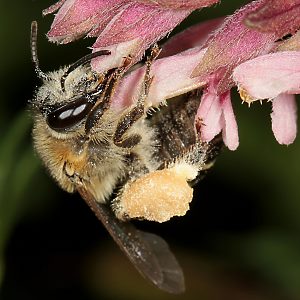 M. tricincta : Das Pollenpaket ist geteilt, da es von der großen Bürste der Hinterschiene (Tibia) ... |
