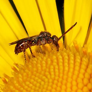 Kuckuck diverser Sandbienen: Nomada fabriciana auf Tussilago farfala · Solingen-Vockert, 28.03.2008 |