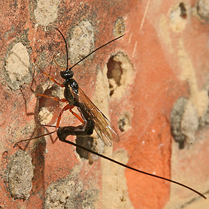 | Merkmale: | 20–30 mm lang, schwarz mit roten Beinen, drei Ocelli auf dem Kopf zwischen den Komplexaugen, sehr langen fadenförmigen Fühlern aus 14 Gliedern, Flügeläderung; u.a. mit langezogenem dunklem Pterostigma (Flügelmal an der Vorderflügel-Vorderkante) und einer Querader, die den Braconidae fehlt. W mit extrem langem Legestachel bzw. -bohrer (Ovipositor), der meist in einer starren Stachelscheide ruht. |