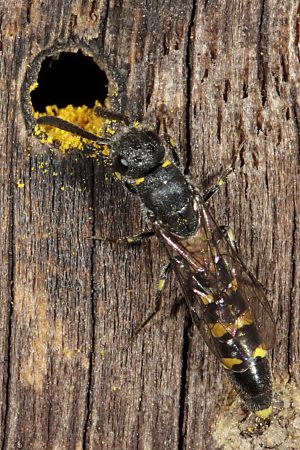 An Totholz-Nisthilfen, alten Zaunpfählen in traditionell eingezäunten Weiden, abgestorbenen Ästen und Baumstämmen etc. sind ab Juni die kleinen schlanken Löcherbienen (Osmia (heriades) truncorum) aktiv. Die kleinen Bauchsammeler sind auf Korbblütler (Asteraceae) spezialisiert und tragen, rückwärts krabbelnd, den meist gelben Pollen in ihre ca. 3,5 mm weiten Nistgänge ein; die Zwischenwände und Nestverschlüsse bauen sie aus Harz. Bei ganz genauem Hinsehen entpuppen sich oft einige besonders schlanke Winzlinge als Keulenwespen: Die auf Löcherbienen spezialisierte Art ist die "Zehnpunkt-Keulenwespe" (Sapygina decemguttata), die sich von der vorgenannten Art durch kleine weiße Flecken seitlich auf den Tergiten unterscheidet.