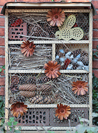 - Bienen sind natürlich auch in unseren Schulen ein Thema, und in den unteren Klassen gehören dazu auch selbstgebaute Bienen-Nisthilfen bzw. "Bienenhotels", "Insektenhäuser" etc. Leider sind diese oft nur begrenzt geeignet oder gar völlig untauglich: Das Lehrpersonal scheint in solchen Fällen mehr an der Bespaßung der Kinder und dem pädagogischen Nutzen eines Gemeinschaftsprojektes interessiert zu sein als an korrekt konstruierten Nisthilfen, die die Fortpflanzungsbiologie unserer Solitärbienen veranschaulichen und gute Vorbilder für den Nachbau abgeben. Die folgenden beiden Bienenhäuser sind nicht nur für Insekten unbrauchbar, sie liefern – schlimmer – gutwilligen, naturfreundlichen Nachahmern falsche Vorbilder: